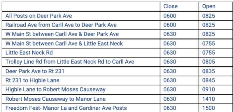 Street closure of Deer Park Avenue will be directly after the 5K Race. Closure will be from Main Street and Deer Park Avenue up to Deer Park Avenue and Park Avenue. All side streets in this area will be closed for street traffic during this time. We anticipate Deer Park Avenue and all side streets to be fully open by 7:00 pm.